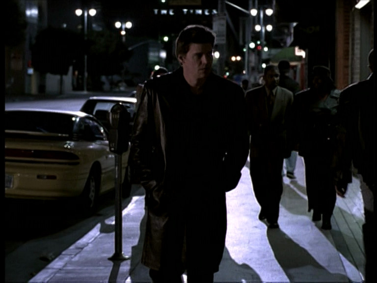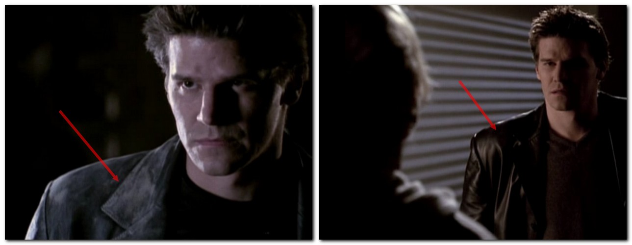 ■ Angel porte son manteau en cuir noir quand il saute du plafond, dans l’entrepôt. Après son atterrissage, le vêtement est recouvert de poussière et de plâtre. La scène suivante, au bureau, il est redevenu propre comme un sou neuf.