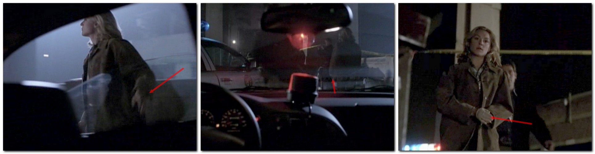 ■ Kate n’a pas de gants quand elle sort de la voiture en arrivant sur les lieux du crime, mais quand elle s’approche de la victime, elle en porte un qu’elle n’a évidemment pas eu le temps d’enfiler entre les deux plans.