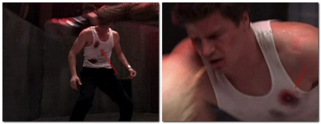 ■ À la 36ème minute, alors qu’il se bat avec Val Trepkos, la tâche de sang sur le débardeur d’Angel, due à une balle tirée plus tôt dans l’épisode, passe du côté droit de sa poitrine au côté gauche avant de revenir à droite dans la scène suivante.