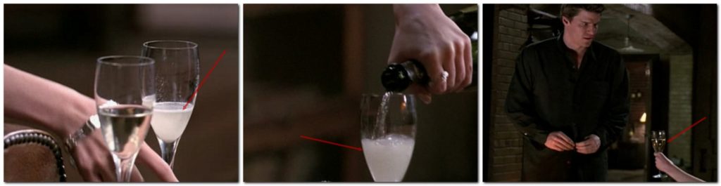 ■ Quand Rebecca met du doximall dans le verre d’Angel, le champagne se trouble et l’effet ne semble pas se dissiper vite. Mais dès que le vampire revient, quelques secondes après, le champagne est parfaitement clair.