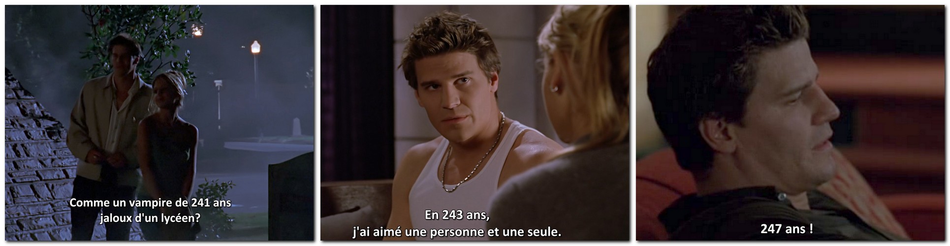 ■ Angel déclare avoir 247 ans. Sachant qu’il a été engendré en 1753, ce que l’on a découvert dans « 2×21 Acathla, partie 1 »), et qu’il avait alors 26 ans. Ce chiffre est tout à fait cohérent (ce qui n’a pas toujours été le cas) si l’on ne prend en compte que son âge vampirique.