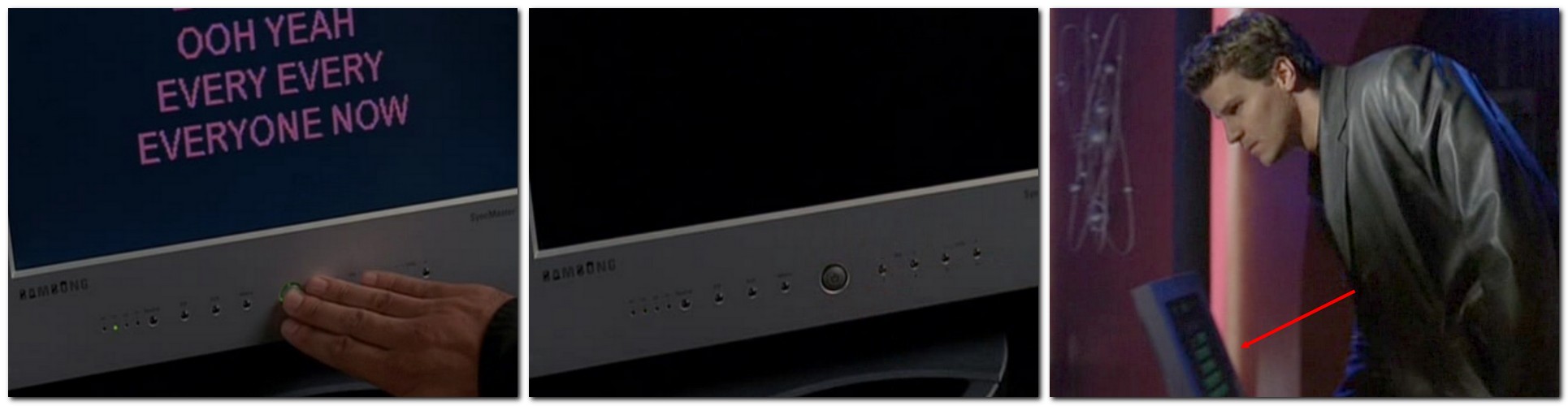 ■ Après avoir chanté à Caritas, Angel s’excuse et éteint l’écran du karaoké. Lorsque la caméra le filme à nouveau de loin, l’écran se rallume.