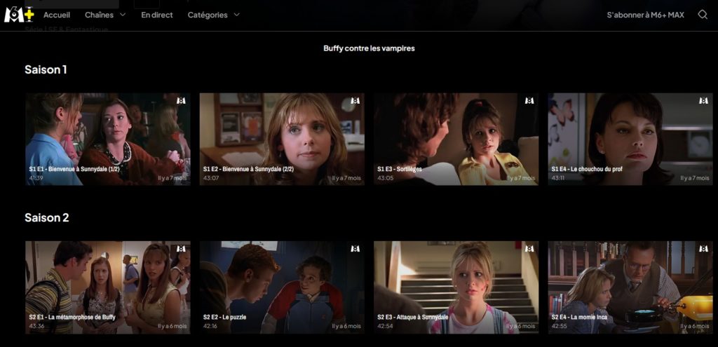 Depuis mercredi 14 janvier, les fans de Buffy contre les vampires peuvent retrouver les 144 épisodes de la série sur M6+, la plateforme de streamng de M6, et le tout gratuitement, pour la première fois. Nous avions eu en bientôt 30 ans de nombreuses rediffusions, avec parfois des épisodes disponibles en replay (en revisionnage) pendant une quinzaine de jours à chaque fois sur les chaînes du groupe M6 (6ter, Téva…), mais jamais l’intégralité de la série disponible en accès libre, et en HD. Jusqu’ici, il fallait être abonné à la plateforme Disney+ plus pour pouvoir regarder le contenu intégral de la série (ainsi que les 110 épisodes de Angel, non disponibles via M6 puisque c’est le groupe TF1 qui en détient les droits de diffusion). C’est désormais possible pour les fans qui ne veulent pas s’abonner et dépenser de l’argent pour revoir leur série favorite en HD. M6 est la chaîne historique détentrice des droits de diffusion Buffy en France.